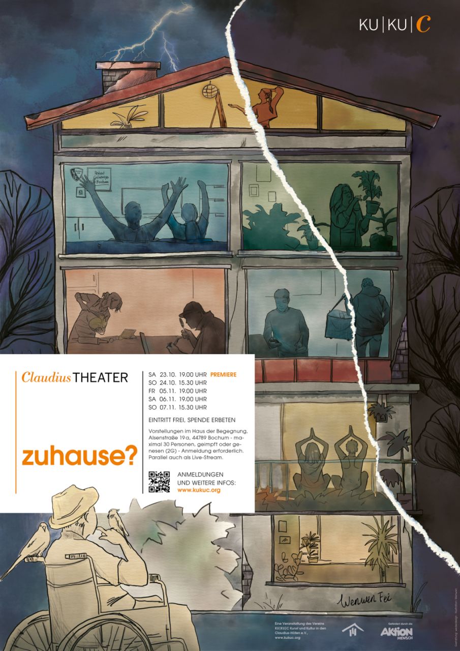 Gegen eine Spende in selbstgewählter Höhe - Minimum 5 Euro wäre schön - können Sie das Plakat zur neuen Produktion "zuHAUSe" im Poster-Format DinA1 bekommen. Die eingenommenen Gelder werden von KU|KU|C für das ClaudiusTHEATER eingesetzt, um einen Ausgleich für die Kosten zu schaffen, die im Rahmen der Coronakrise entstanden sind. Vielen Dank für Ihre Unterstützung. Melden Sie sich bei Interesse unter info@kukuc.org - Sie können das Plakat vor Beginn einer Probe vor dem Haus der Begegnung abholen und dort Ihre Spende abgeben.